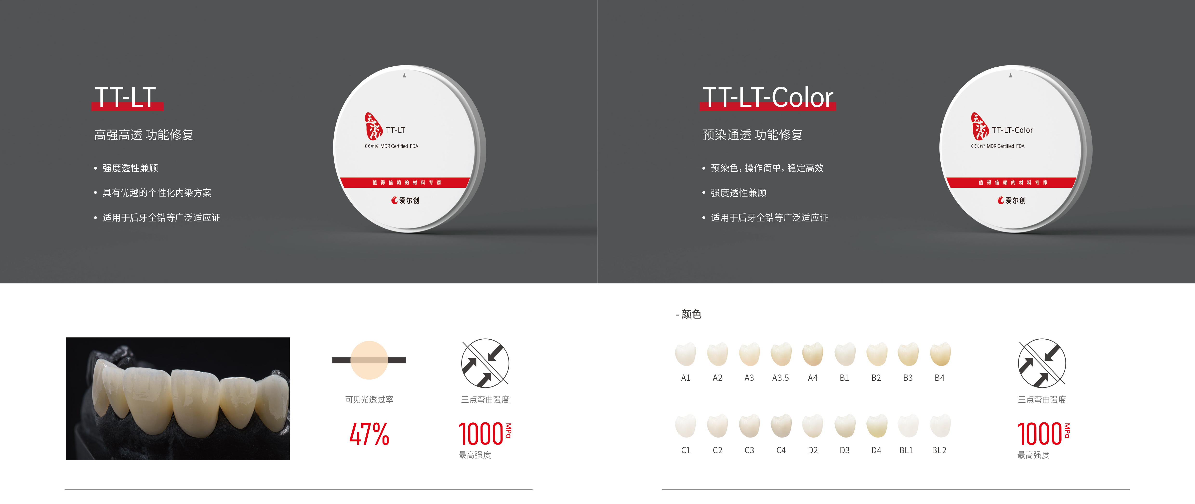 爱尔创全瓷义齿用氧化锆陶瓷是多晶陶瓷类义齿修复材料,涵盖爱尔创瓷倍健、爱尔创魅影和爱尔创玉瓷三大义齿品牌。爱尔创玉瓷旗下材料具有极高的透性,适合制作高端仿真美学修复体。